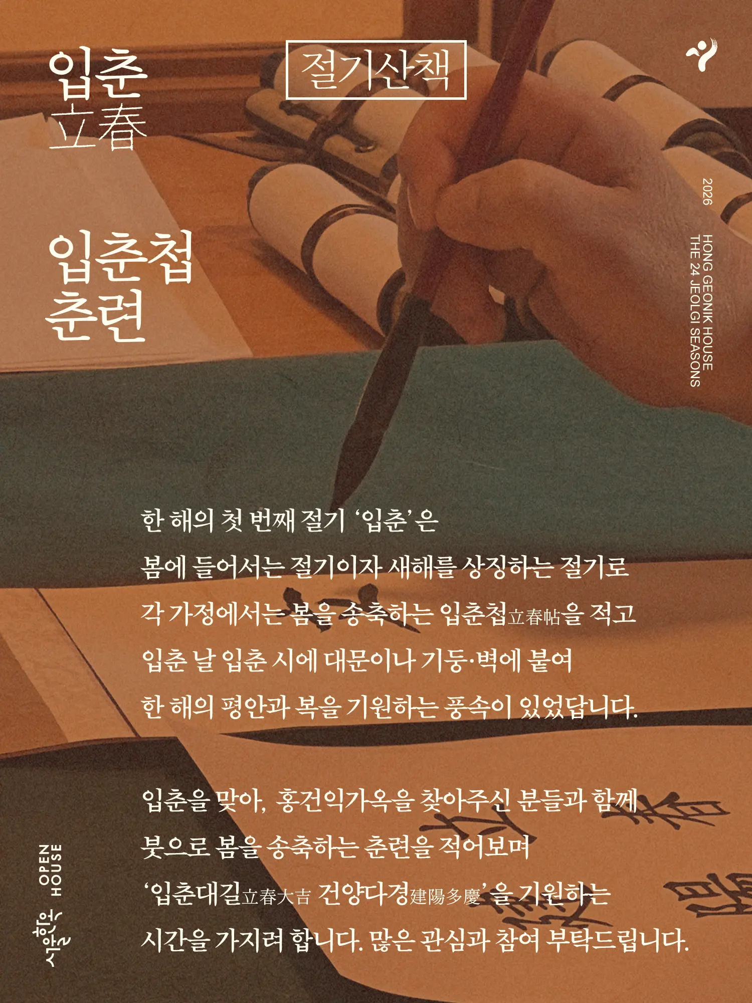 입춘을 맞아, 홍건익가옥을 찾아주신 분들과 함께 붓으로 봄을 송축하는 입춘첩을 편하게 적어보며 ‘입춘대길立春大吉 건양다경建陽多慶’을 기원하는 시간을 가지려 합니다.