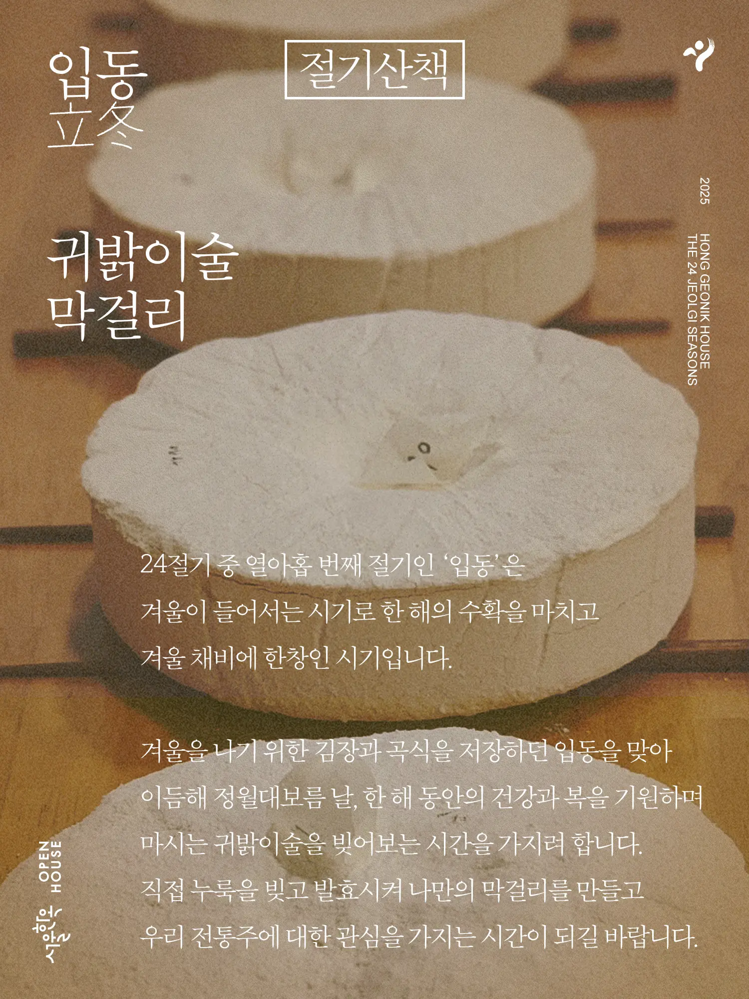 겨울을 나기 위한 김장과 곡식을 저장하던 입동을 맞아, 이듬해 정월대보름 날 한 해 동안의 건강과 복을 기원하며 마 귀밝이 술을 빚어보는 시간을 가지려 합니다.