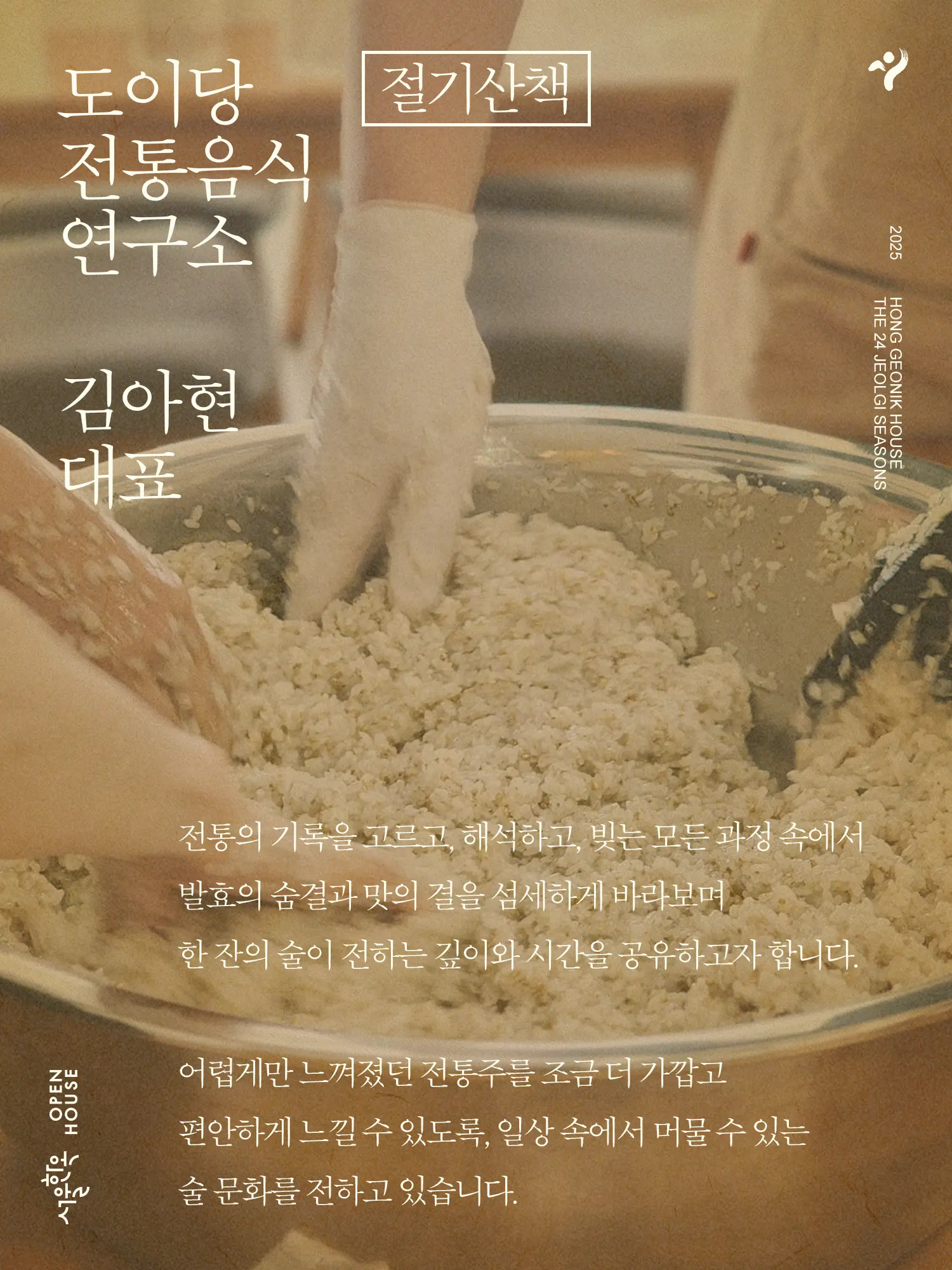직접 누룩을 빚고 발효시켜 나만의 막걸리를 만들고 우리 전통주에 대한 관심을 가지는 시간이 되길 바랍니다. 계절의 변화를 알리는 중요한 일상의 매듭이었던 절기를 통해 지역 이웃과 교류하고 소통하는 시간이 되기를 기대합니다.