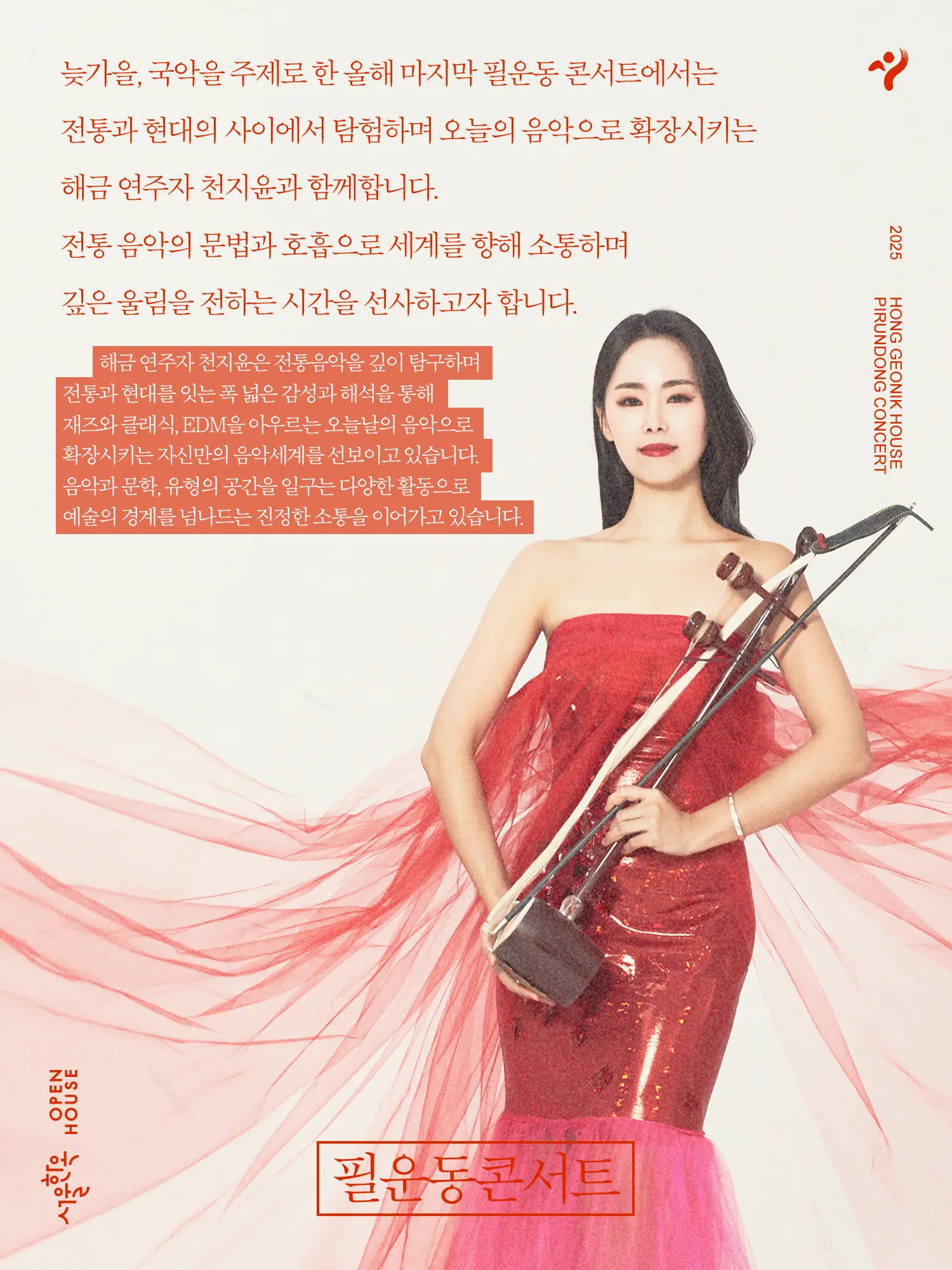 늦가을, 국악을 주제로 한 올해 마지막 필운동 콘서트에서는 전통과 현대의 사이에서 탐험하며 오늘의 음악으로 확장시키는 해금 연주자 천지윤과 함께합니다.