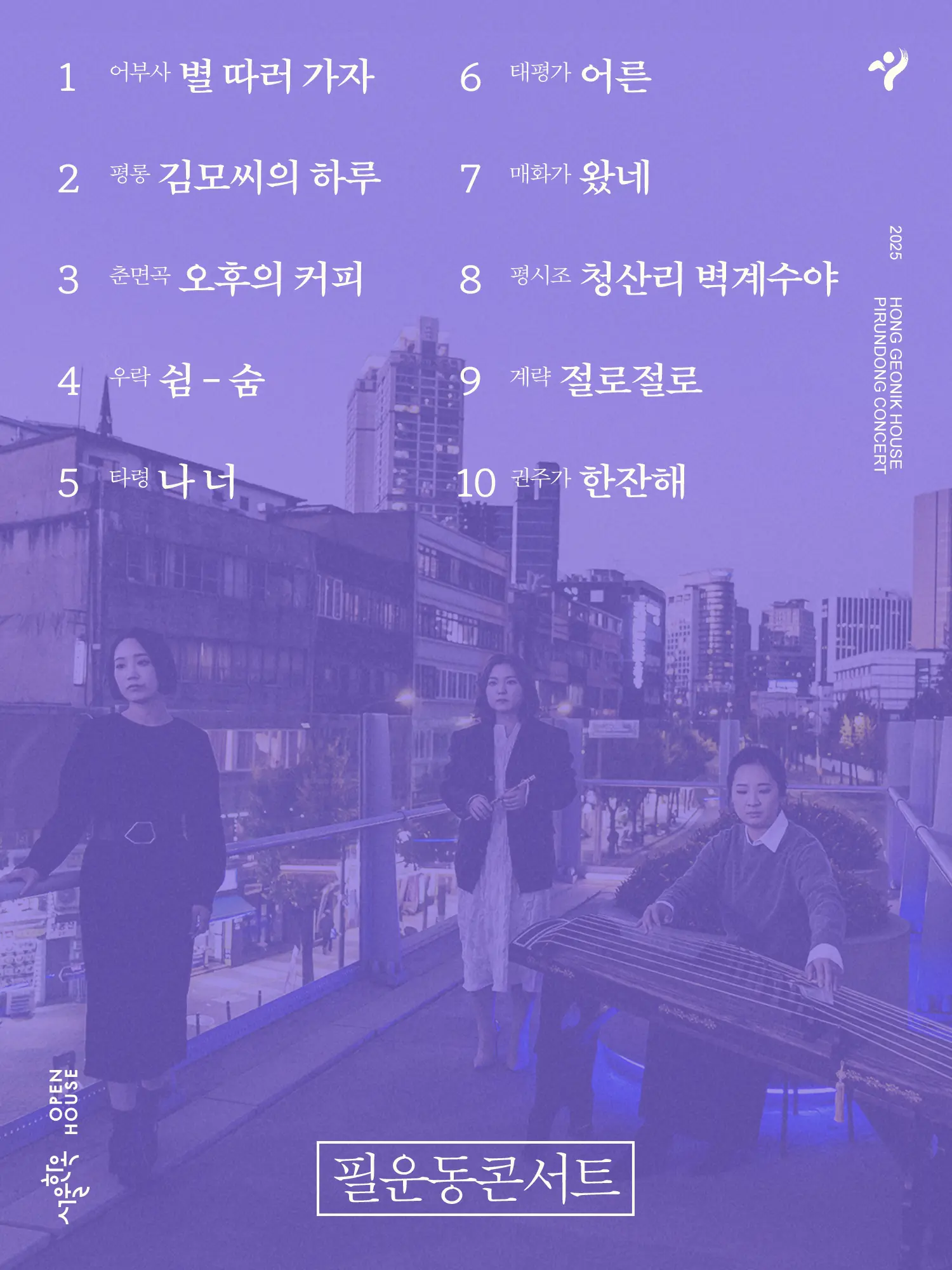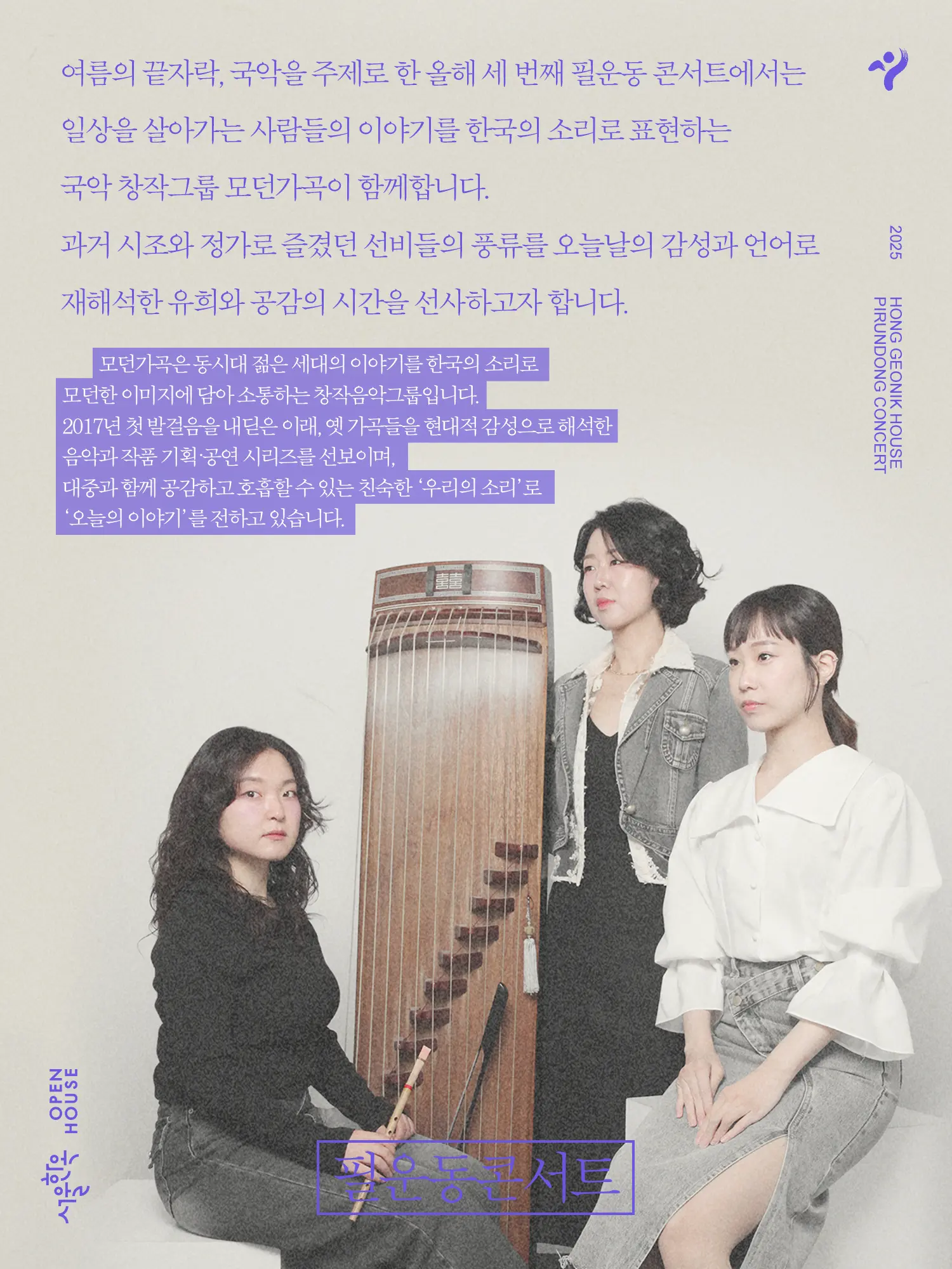 여름의 끝자락, 국악을 주제로 한 올해 세 번째 필운동 콘서트에서는 일상을 살아가는 사람들의 이야기를 한국의 소리로 표현하는 국악 창작그룹 모던가곡이 함께합니다.